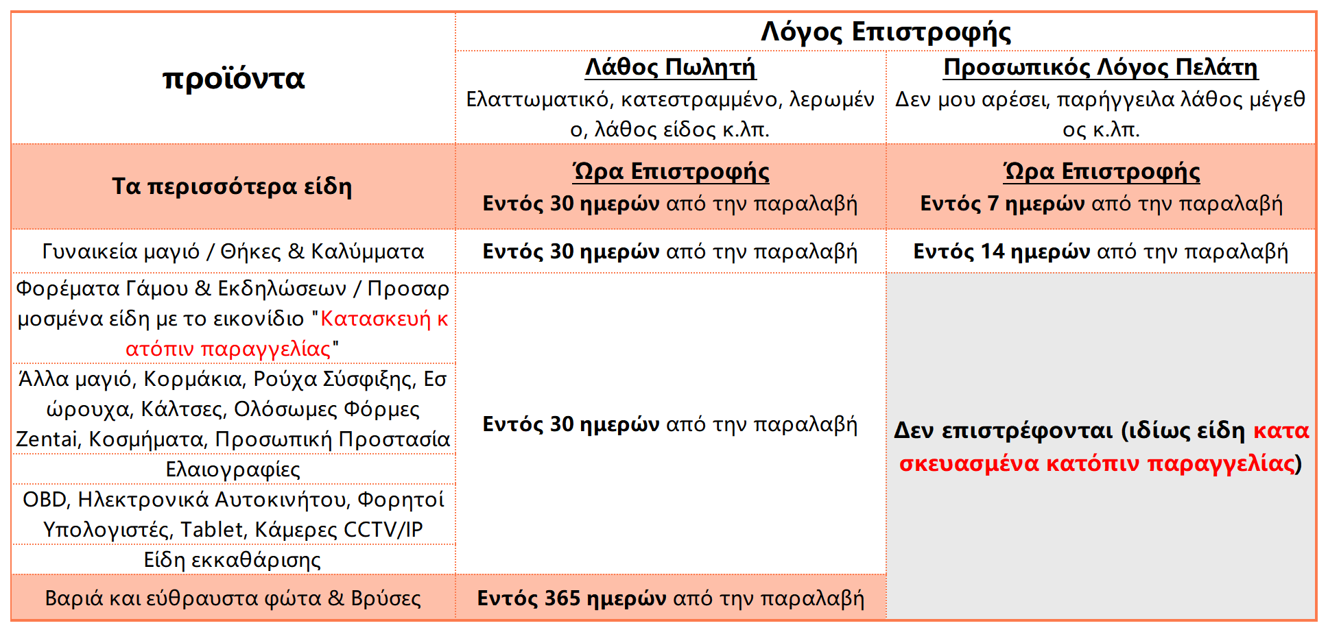 Με εξαίρεση μερικών προϊόντων που κατασκευάζονται κατόπιν παραγγελίας, προσαρμοσμένων ή ειδικών προϊόντων όπως απαιτείται από τους νόμους που ισχύουν στις τοπικές χώρες ή περιοχές σας, το μεγαλύτερο μέρος των προϊόντων μπορεί να επιστραφεί. Ωστόσο, οι συγκεκριμένες συνθήκες ποικίλουν ανάλογα με τον λόγο της επιστροφής και τον τύπο του προϊόντος. Παρακαλούμε ανατρέξτε στον παρακάτω πίνακα για λεπτομέρειες.